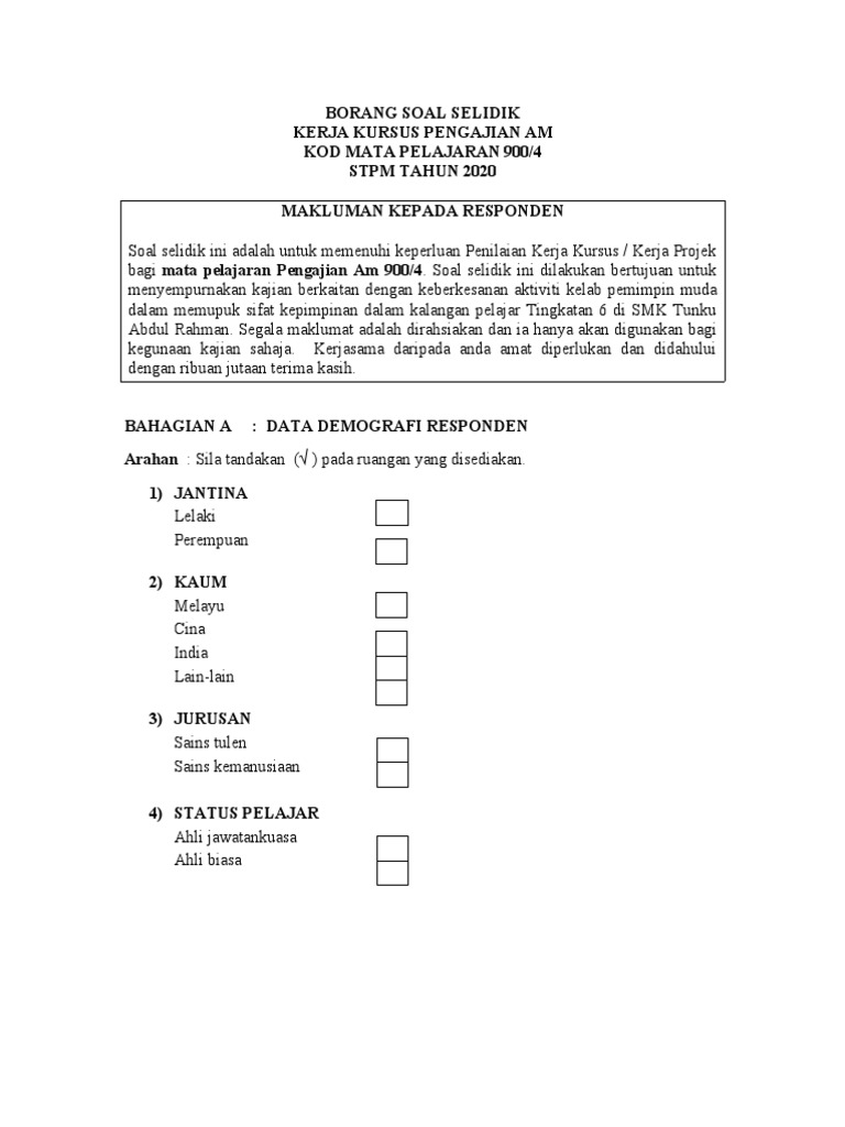 Contoh borang soal selidik kajian pengajian am.