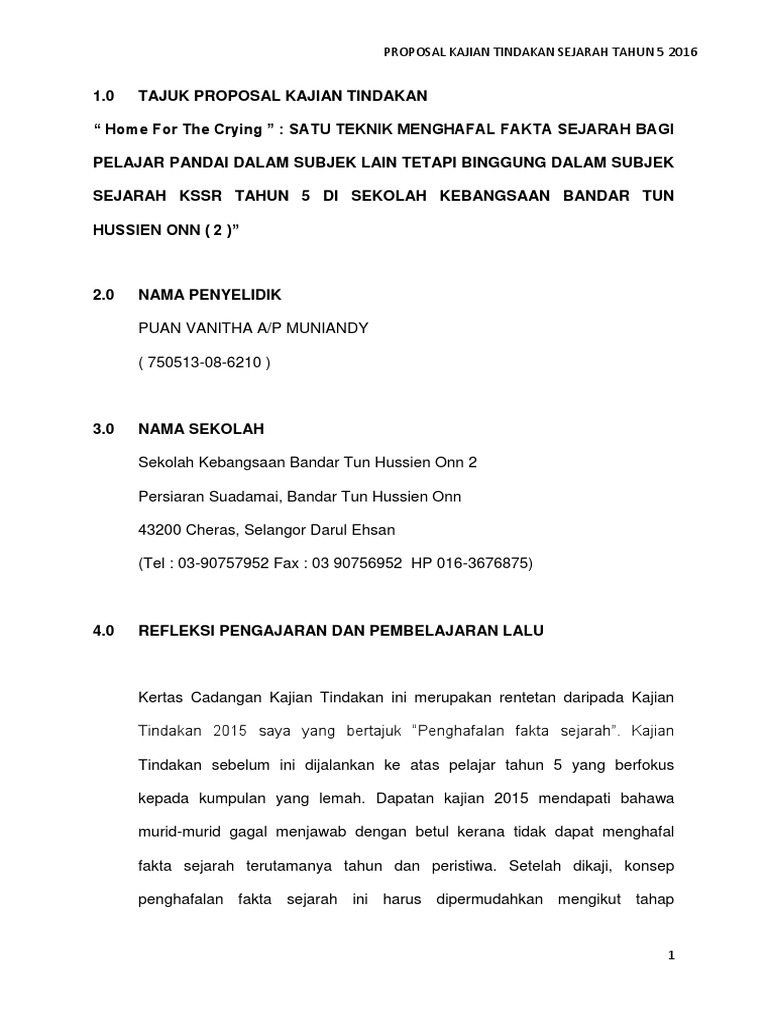 Berdasarkan perbandingan ujian peringkat pra dan ujian pasca dan pemerhatian sikap murid. Kajian ini telah saya bentang di peringkat negeri dan kebangsaan pada tahun 2007. Kpd3026 kajian tindakan kertas cadangan kajian tindakan penggunaan gambar dalam p&p untuk membantu pelajar mengingat fakta 1.0 nama dan alamat sekolah sekolah menengah kebangsaan sultan abdul aziz, jalan padang tembak, 36000 teluk intan, perak 2.0 penyelidik muhammad hussaini bin husain 3.0 tajuk kajian penggunaan gambar dalam pengajaran dan pembelajaran (p&p) untuk membantu pelajar mengingat. Nov 07, 2013 · saya pernah menghasilkan satu kajian tindakan berkaitan mata pelajaran sejarah yang bertajuk "meningkatkan keupayaan mengingat fakta bagi menjawab soalan struktur dan esei sejarah dengan menggunakan kaedah akronim dan mneumonic". 2.saya cadangkan anda pilih satu model dan kaji model tersebut secara mendalam sebelum pengajaran dijalankan.